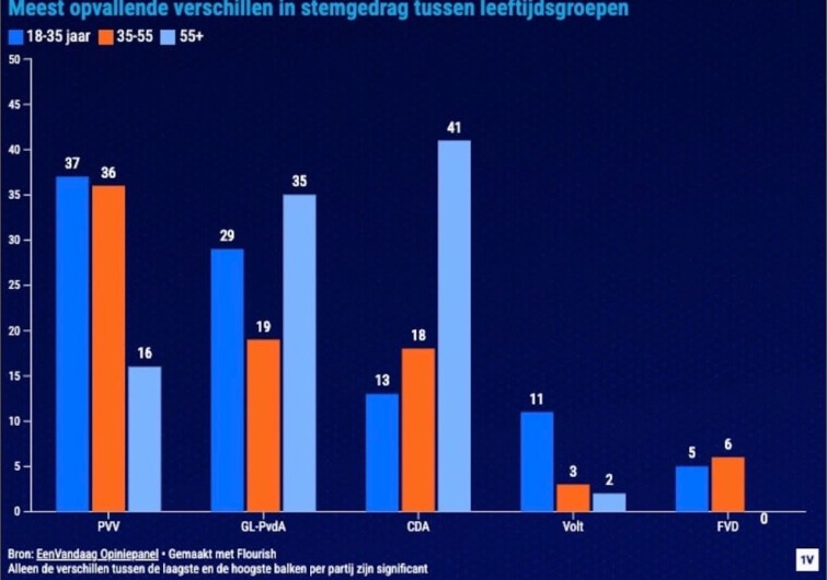 De peiling laat opvallende leeftijdsverschillen zien. Onder jongeren haalt de PVV 37 zetels, bij mensen van middelbare leeftijd 36, maar bij 55-plussers nog maar 16. Oudere kiezers trekken juist massaal naar het CDA: dat zou bij 55-plussers 41 zetels krijgen, tegenover slechts 13 bij jongeren.