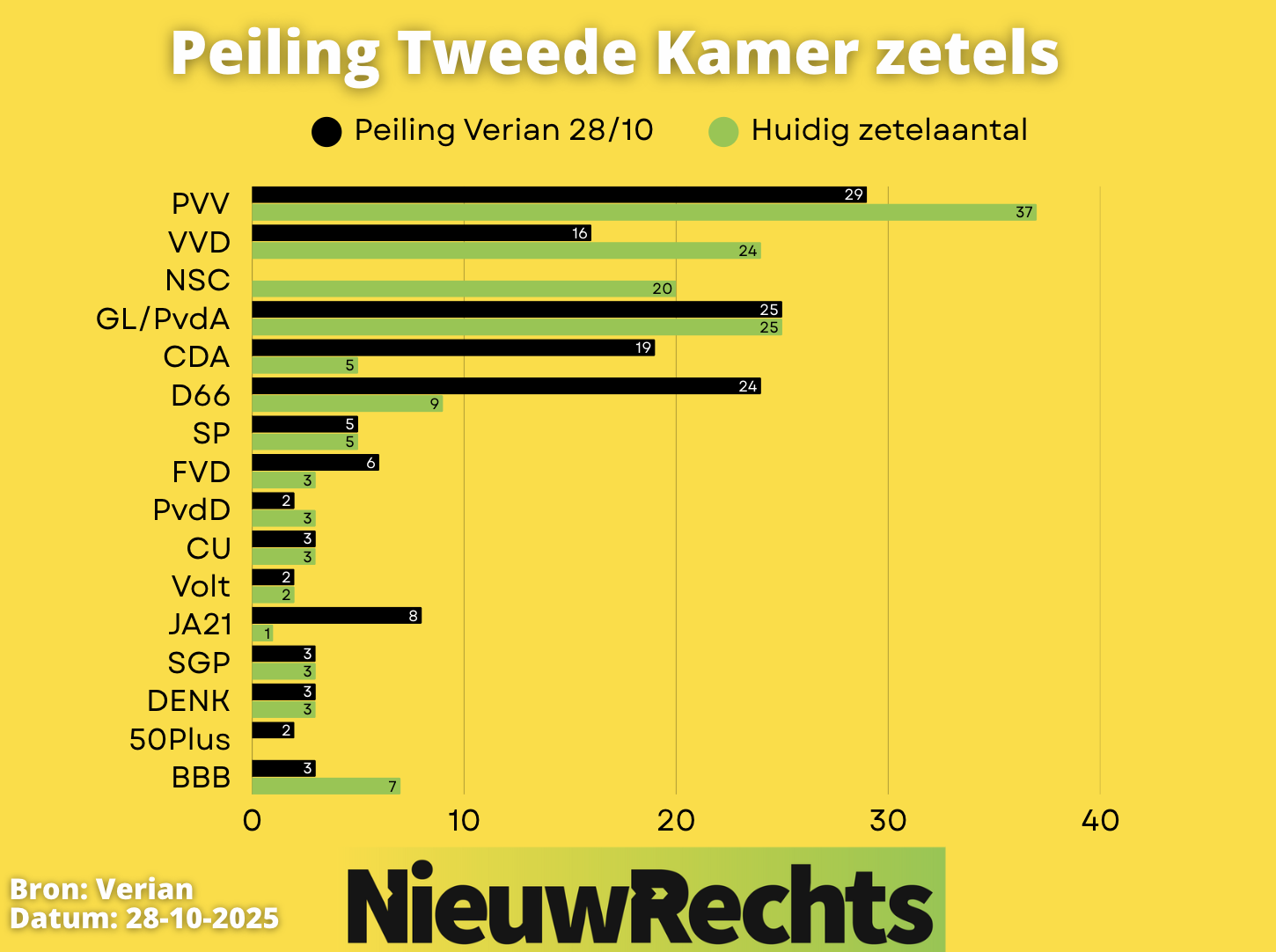 Met nog één dag tot de Tweede Kamerverkiezingen laat de laatste slotpeiling van EenVandaag en Verian grote verschuivingen zien. D66 maakt een verrassende sprong van acht zetels en komt uit op 24 zetels. Daarmee kruipt de partij van Rob Jetten dicht in de buurt van GroenLinks-PvdA (25 zetels) en de PVV, die met 29 zetels koploper blijft, maar wel vijf zetels verliest ten opzichte van vorige week. Ook JA21 levert fors in (4 zetels). In de slotpeiling van Ipsos I&O ontstaat juist een compleet ander beeld: daar staan de PVV, GL/PvdA en D66 alledrie op 23 zetels.