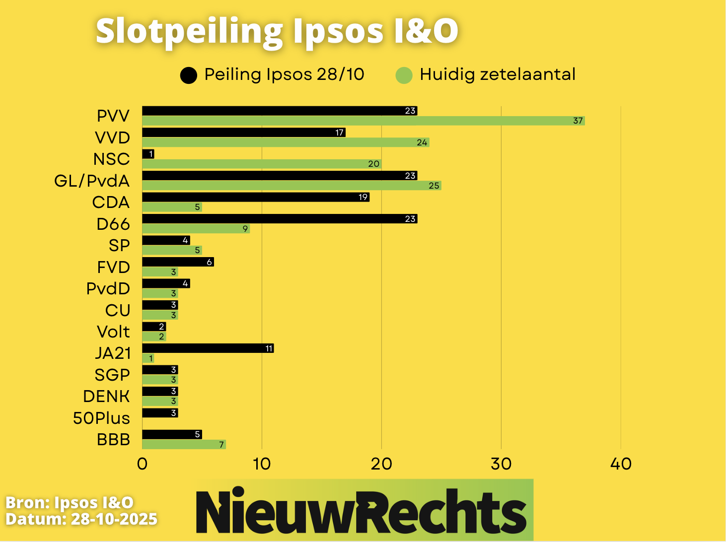 De slotpeiling van Ipsos I&O verschilt wezenlijk van de net uitgekomen slotpeiling van Verian. Volgens Ipsos belooft de verkiezingen van woensdag een driestrijd te worden tussen PVV, GL/PvdA en D66. Alle drie die partijen worden op 23 zetels gepeild. Het CDA van Henri Bontenbal duikt, net als bij Verian, onder de 20 zetels. Andere opvallende trends: JA21 peilt bij Ipsos wel boven de 10 zetels, maar bij Verian niet. En zowel bij Ipsos als bij Verian zit FVD in de lift.