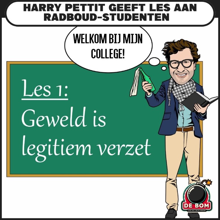 Het studiejaar is in volle gang en dus geeft ook docent Harry Pettit weer college op de Radboud Universiteit. Hij geeft zijn studenten een bijzondere les mee: "Geweld is legitiem verzet!" Dat zijn nou wijsheden die de studenten nergens anders horen...