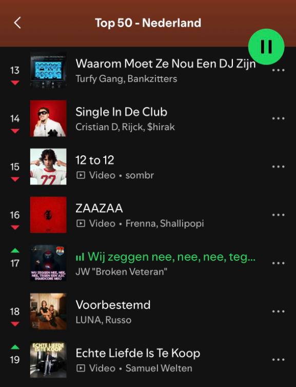 Een door kunstmatige intelligentie gemaakt liedje met een anti-azc-boodschap is razendsnel gestegen in de Nederlandse hitlijsten. Het nummer ‘Wij zeggen nee, nee, nee, tegen een azc (Hardcore Mix)’ van de maker JW ‘Broken Veteran’ bereikte afgelopen weekend de 28e plek in de Single Top 100 en staat op nummer 17 in de lijst van meest gestreamde nummers op Spotify.