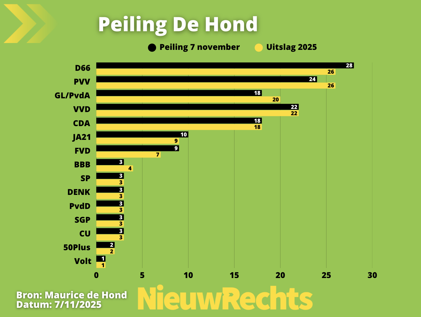 De wekelijkse zetelpeiling van Maurice de Hond laat beperkte verschuivingen zien in het politieke landschap. Toch tekenen zich enkele opvallende trends af. Forum voor Democratie (FVD) wint terrein, vooral ten koste van de PVV, terwijl D66 kiezers aantrekt die eerder voor GroenLinks-PvdA kozen. JA21 laat een lichte stijging zien, maar BBB zakt iets weg.