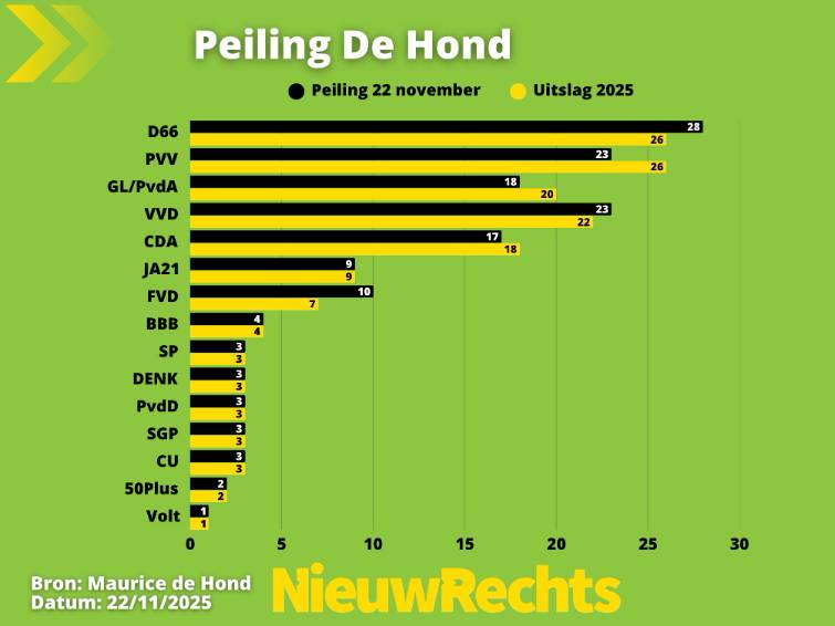 Volgens de peiling zou het gat tussen D66 en PVV een stuk groter worden. Die eerste partij staat op 28 zetels en PVV zakt weg naar 23. VVD wint een zetel en CDA verliest er één. Het linkse blok van GroenLinks/PvdA raakt twee zetels kwijt.