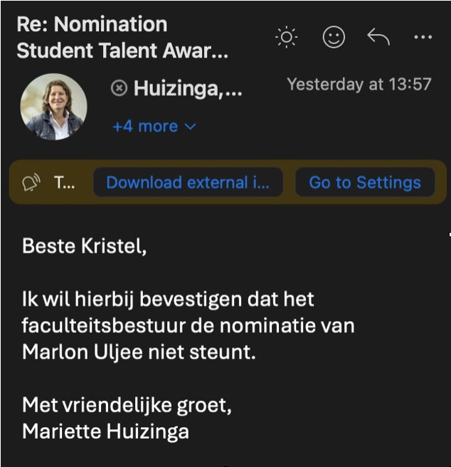 De initiële afwijzing vanuit het faculteitsbestuur was dat ‘een uitgevoerd onderzoek’ op zichzelf onvoldoende zou zijn. Er werd hier verbouwereerd op gereageerd en een e-mail gestuurd waarin zij benadrukten dat de nominatie op veel meer was gebaseerd, met name op het succesvol opbouwen van een landelijke studentenbeweging. De raad betreurde de afkeuring.