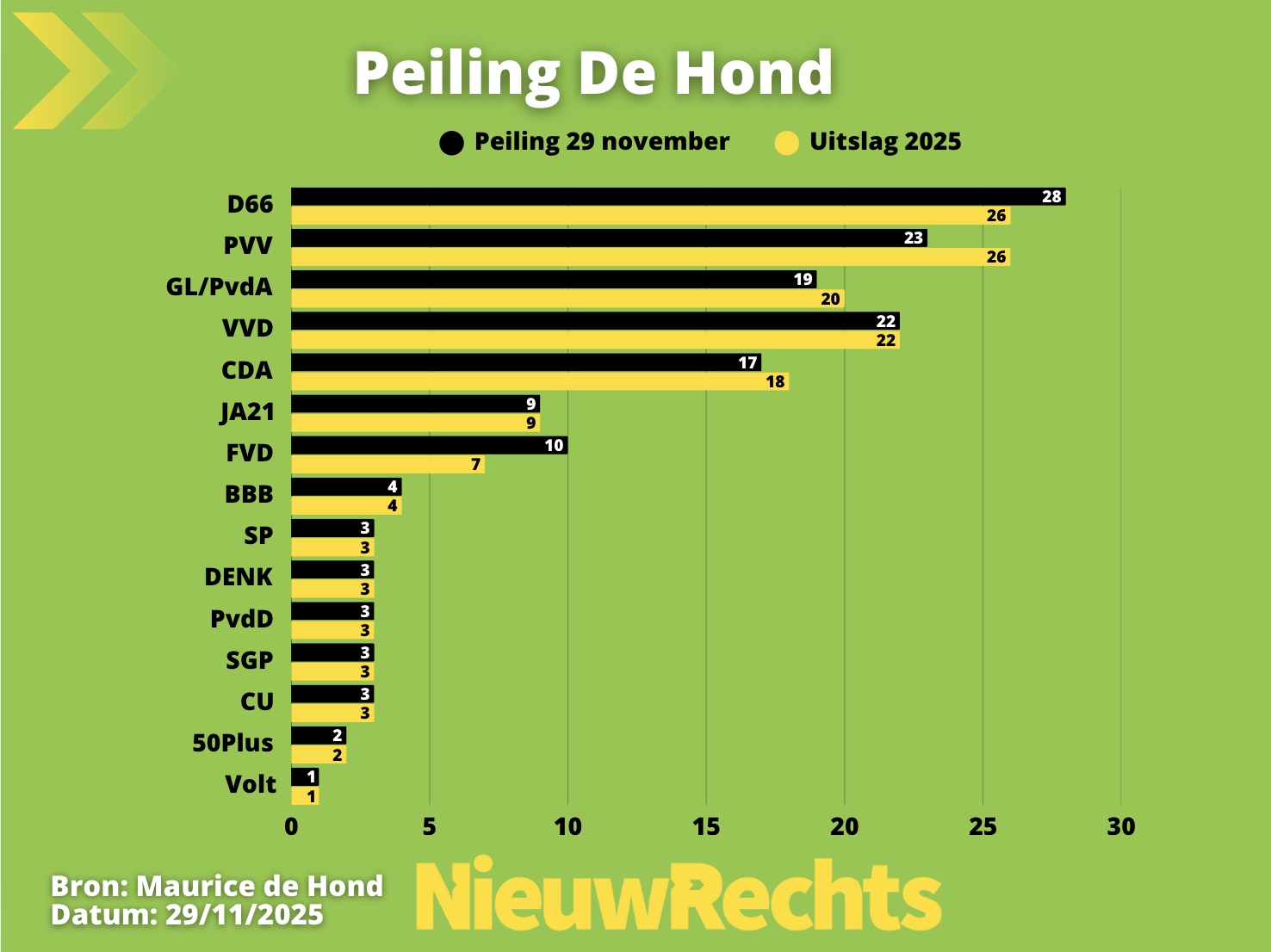 De nieuwste peiling van Maurice de Hond bevestigt de trend dat de PVV in populariteit inlevert. Eerder deze week kwam onderzoeksbureau Verian al met een peiling waarin de PVV op verlies stond. Volgens de nieuwe cijfers wint D66 twee zetels ten opzichte van de eerste na-verkiezingsmeting. FVD stijgt drie zetels. De PVV levert drie zetels in. GroenLinks-PvdA en het CDA zakken beide twee zetels. De verhoudingen tussen mogelijke regeringscombinaties blijven daarmee onveranderd.