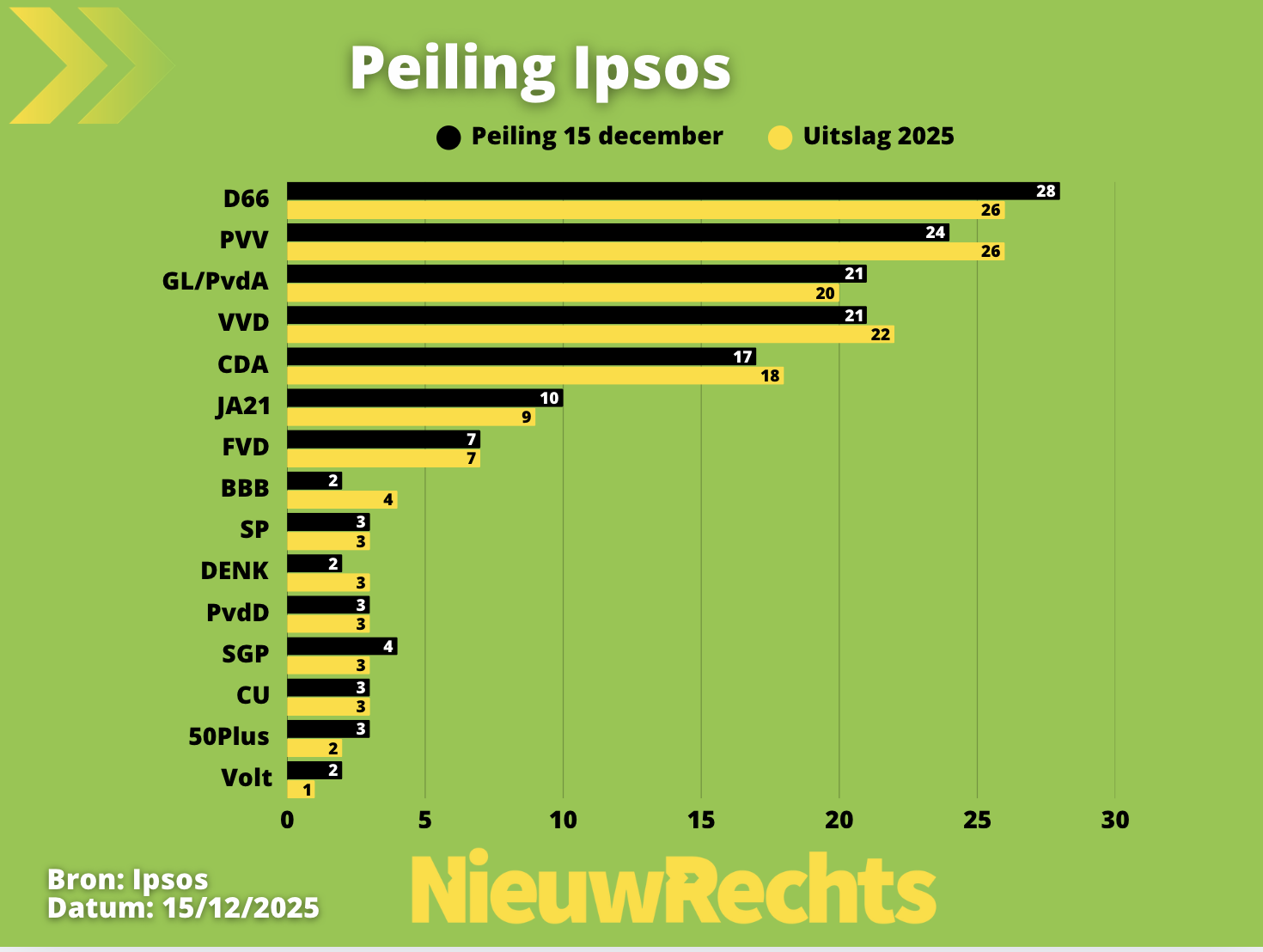 Ruim twee maanden na de Tweede Kamerverkiezingen van 29 oktober zijn de politieke verhoudingen nauwelijks verschoven. Dat blijkt uit de eerste zetelpeiling van Ipsos I&O sinds de stembusgang. D66 blijft de grootste partij van het land. Als er nu verkiezingen zouden zijn, komt D66 uit op 28 zetels. Dat is geen significante verandering ten opzichte van de huidige 26 zetels. De partij behoudt daarmee haar koppositie, ondanks een moeizame formatie en beperkte publieke steun voor het geschetste kabinet. De PVV volgt op afstand. De partij van Geert Wilders zou volgens de peiling uitkomen op 24 zetels. Dat zijn er twee minder dan bij de verkiezingen, maar het verschil met D66 is statistisch significant. De VVD en GroenLinks-PvdA delen de derde plaats met elk 21 zetels.