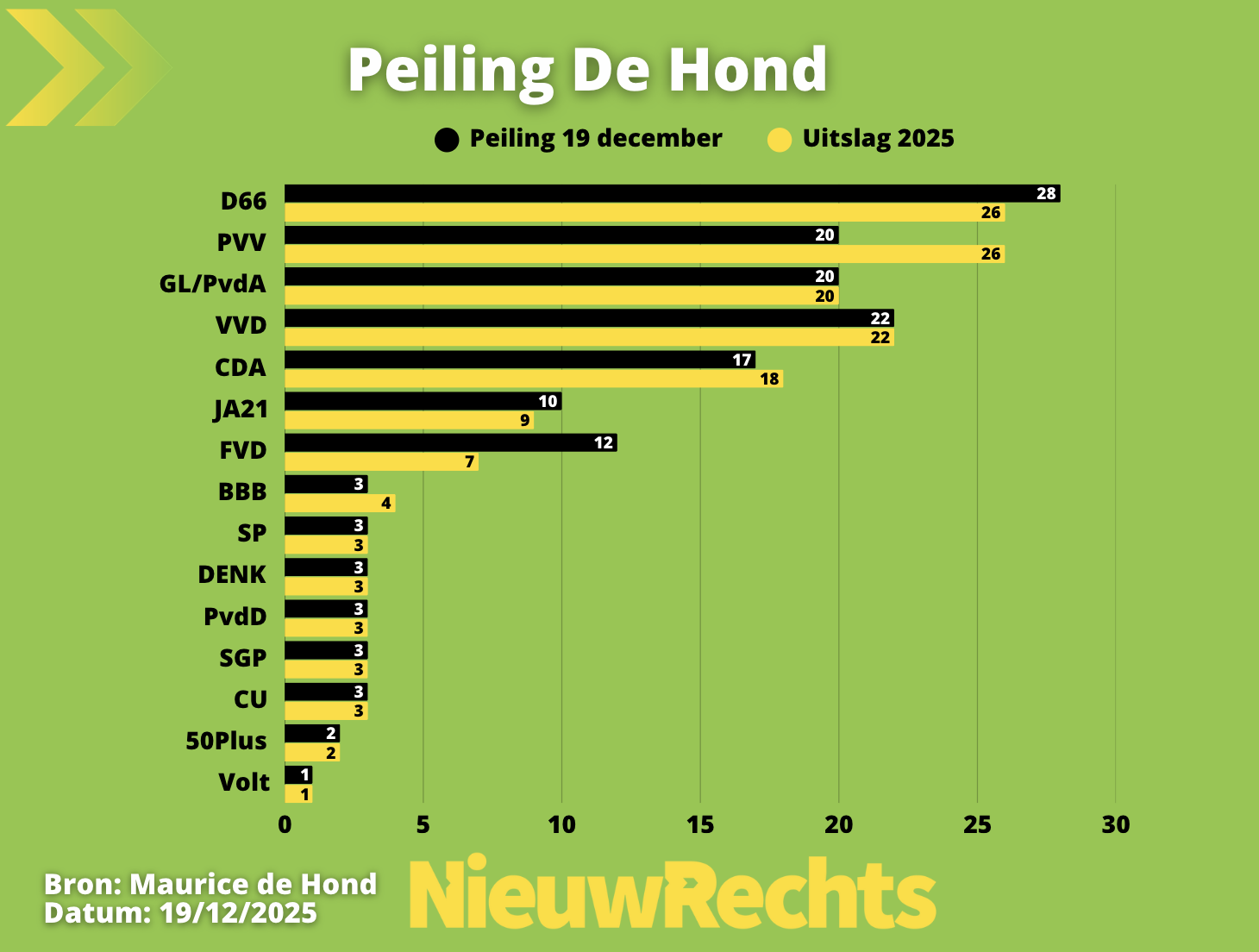 Na de verkiezingen verloor de PVV in november al drie zetels. In december komt daar opnieuw een verlies van drie zetels bij. Daarmee bereikt de partij het laagste niveau sinds begin november 2023. De daling steekt af tegen de relatieve stabiliteit bij andere partijen. De meeste zetelverschuivingen blijven beperkt. Toch is er één duidelijke winnaar. Forum voor Democratie stijgt door naar 12 zetels. Dat zijn er vijf meer dan bij de verkiezingen. Ook JA21 wint licht en komt uit op 10 zetels. BBB verliest een zetel en staat nu op 3.