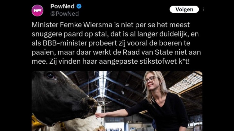 In het bericht schreef PowNed: ‘Minister Femke Wiersma is niet per se het meest snugger paard op stal, dat is al langer duidelijk, en als BBB-minister probeert zij vooral de boeren te paaien, maar daar werkt de Raad van State niet aan mee. Zij vinden haar aangepaste stikstofwet k*t.’