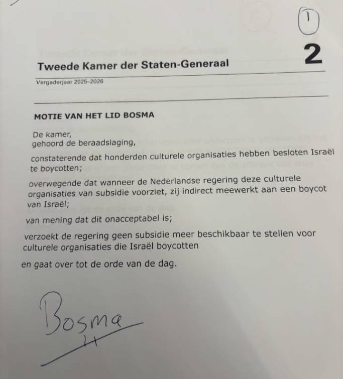 PVV-Kamerlid Martin Bosma heeft een motie ingediend waarin hij oproept om geen overheidssubsidie meer te verstrekken aan culturele organisaties die Israël boycotten. De motie is ingediend tijdens het huidige vergaderjaar van de Tweede Kamer. Bosma stelt dat honderden culturele organisaties hebben besloten Israël te boycotten. Volgens hem werkt de Nederlandse overheid indirect mee aan die boycot zolang deze organisaties publieke middelen ontvangen.