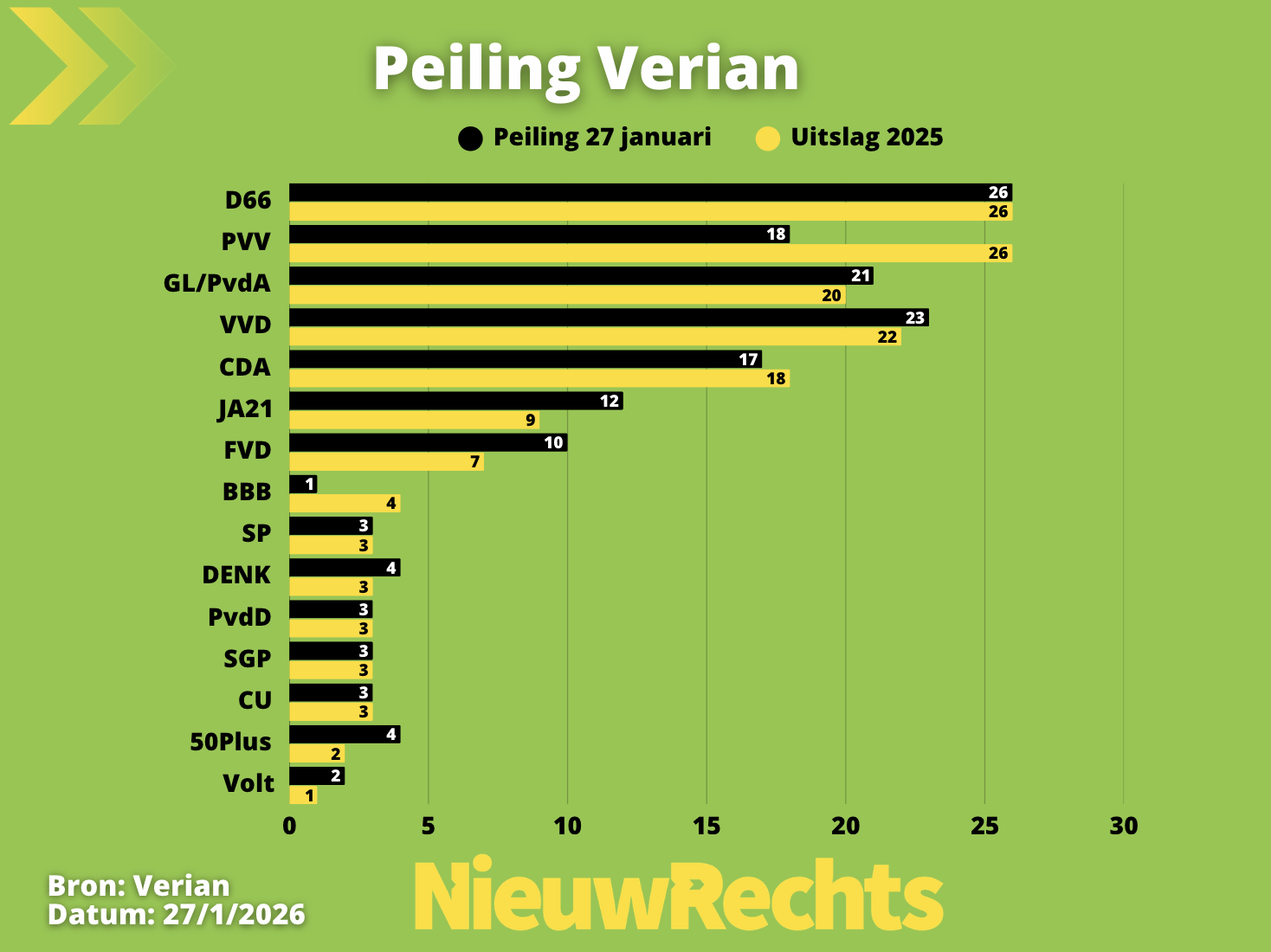 De verschuivingen direct na de verkiezingen blijken van korte duur. In de nieuwste zetelpeiling van Verian en EenVandaag keren kiezers terug naar hun oude politieke keuzes. D66 verliest terrein aan GroenLinks-PvdA. De PVV zakt verder weg, terwijl JA21 groeit. Vergeleken met november leveren D66 en GroenLinks-PvdA elk vijf zetels in en uit. D66 komt uit op 26 zetels. GroenLinks-PvdA stijgt naar 21 zetels. Beide partijen staan daarmee weer op het niveau van de verkiezingsuitslag.