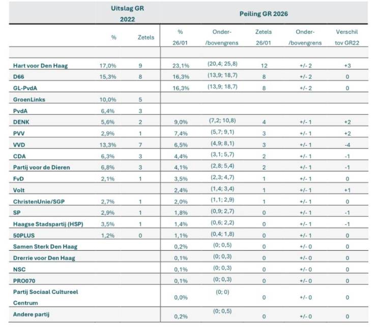 Hart voor Den Haag van Richard de Mos staat in een eerste peiling op winst bij de komende gemeenteraadsverkiezingen. De partij groeit volgens Ipsos I&O van 9 naar 12 zetels. Daarmee zou bijna een derde van de Haagse kiezers stemmen op de lokale partij. Geen enkele andere partij komt in de buurt. D66 blijft in de peiling steken op 8 zetels en is daarmee de tweede partij van de stad. Ook GroenLinks-PvdA komt samen uit op 8 zetels en blijft daarmee op het niveau van de huidige fracties.