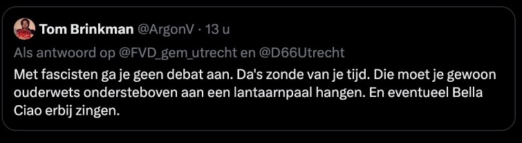 Een ambtenaar uit de omgeving Enschede heeft een ernstige bedreiging geuit jegens de 19-jarige FVD-lijsttrekker in Utrecht, Nina Bodnárová. Volgens de Tukker is het 'zonde van je tijd' om het debat aan te gaan met 'fascisten'. In plaats daarvan zegt hij: 'Die moet je gewoon ouderwets ondersteboven aan een lantaarnpaal hangen. En eventueel Bella Ciao erbij zingen.'