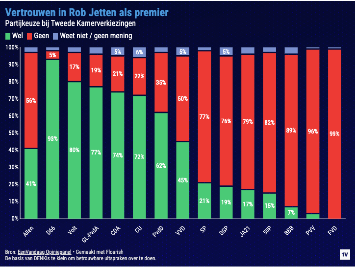 Premier Rob Jetten start met een vertrouwenscijfer van 41 procent, wat lager is dan zijn voorgangers Rutte (51 procent) en Schoof (57 procent) in hun eerste termijn. Hoewel er complimenten zijn over zijn "positiviteit en visie", vinden kiezers dat Jetten "blunderde" in de kwestie rondom partijgenoot Nathalie van Berkel. Van Berkel trok zich terug als staatssecretaris van Financiën en later als Tweede Kamerlid, na onwaarheden op haar cv. Een VVD-stemmer stelt: "Hij heeft niet sterk gehandeld en niet als leider opgetreden. Hij had haar direct weg moeten sturen en dat niet aan haarzelf moeten overlaten. Een valse start."
