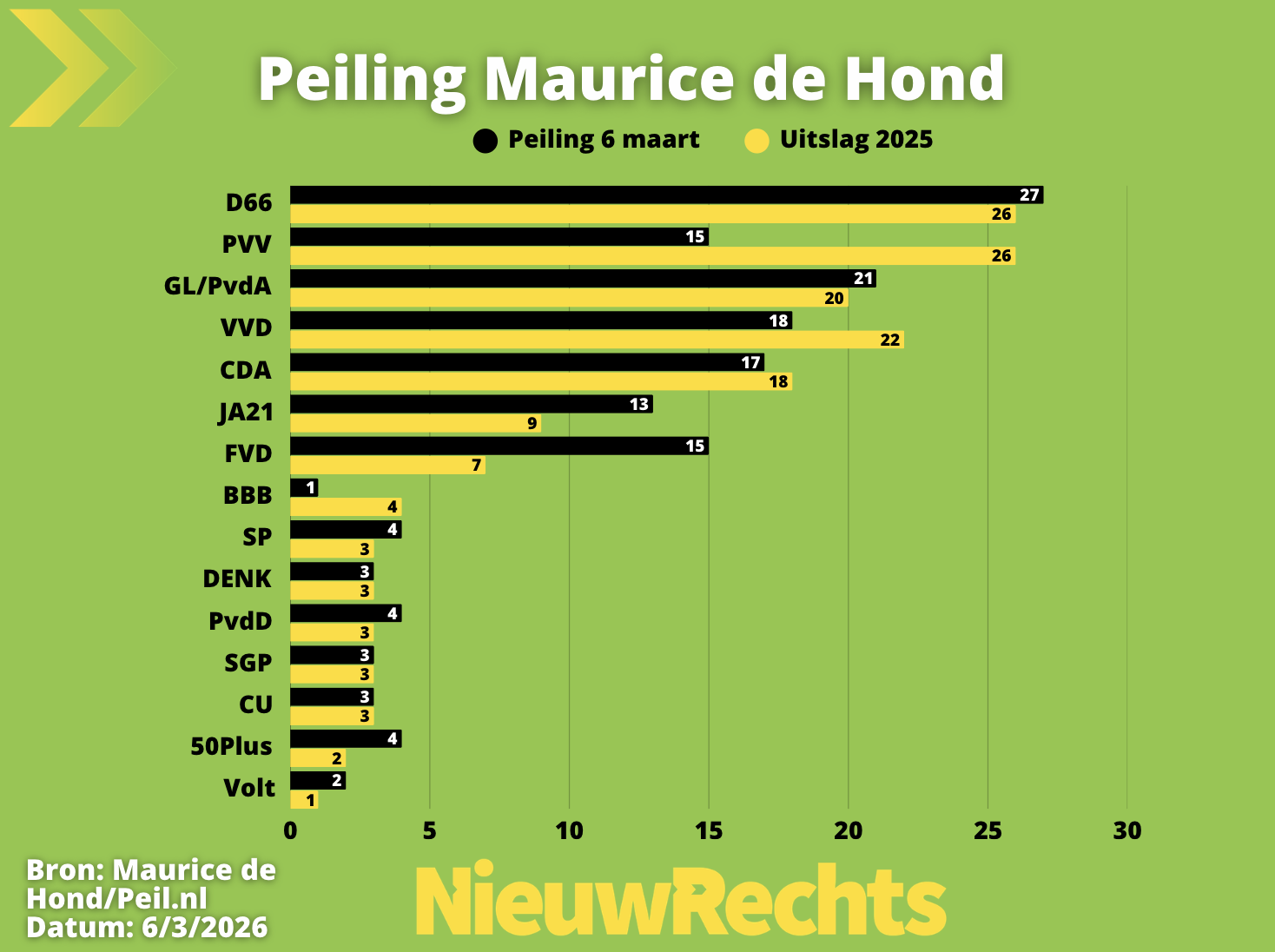 Forum voor Democratie (FVD) blijft stijgen in de peilingen. De partij van Lidewij de Vos zou volgens de laatste peiling van Maurice de Hond en Peil.nl uitkomen op vijftien zetels. Dat zijn er net zoveel als PVV. Ook JA21 doet het met dertien zetels erg goed.