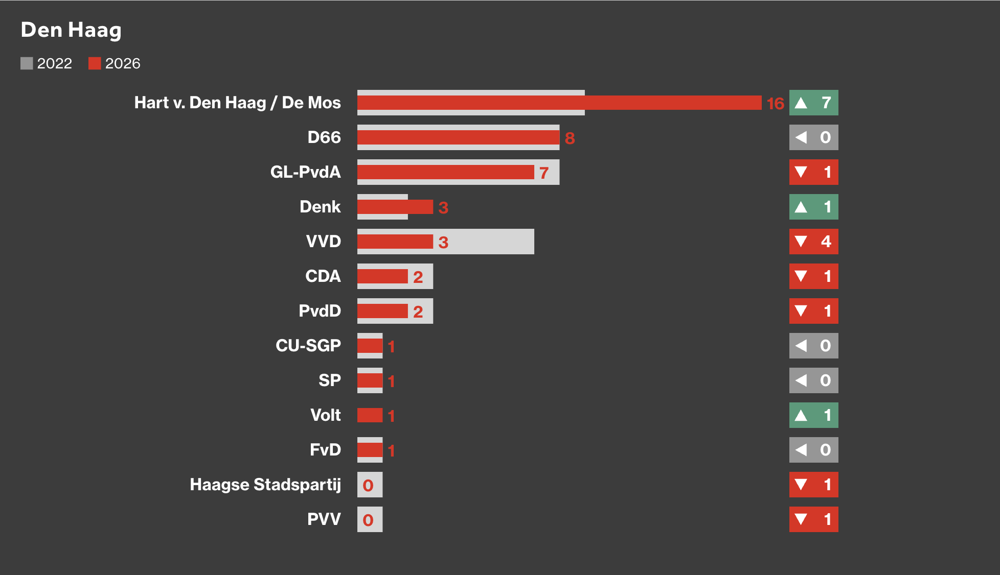 Hart voor Den Haag van Richard de Mos pakt maar liefst 16 zetels in de Hofstad. Dat is een forse sprong ten opzichte van de gemeenteraadsverkiezingen van 2022, toen Hart voor Den Haag bleef steken op 9 zetels. De Mos pakt bijna eenderde van alle stemmen in Den Haag.