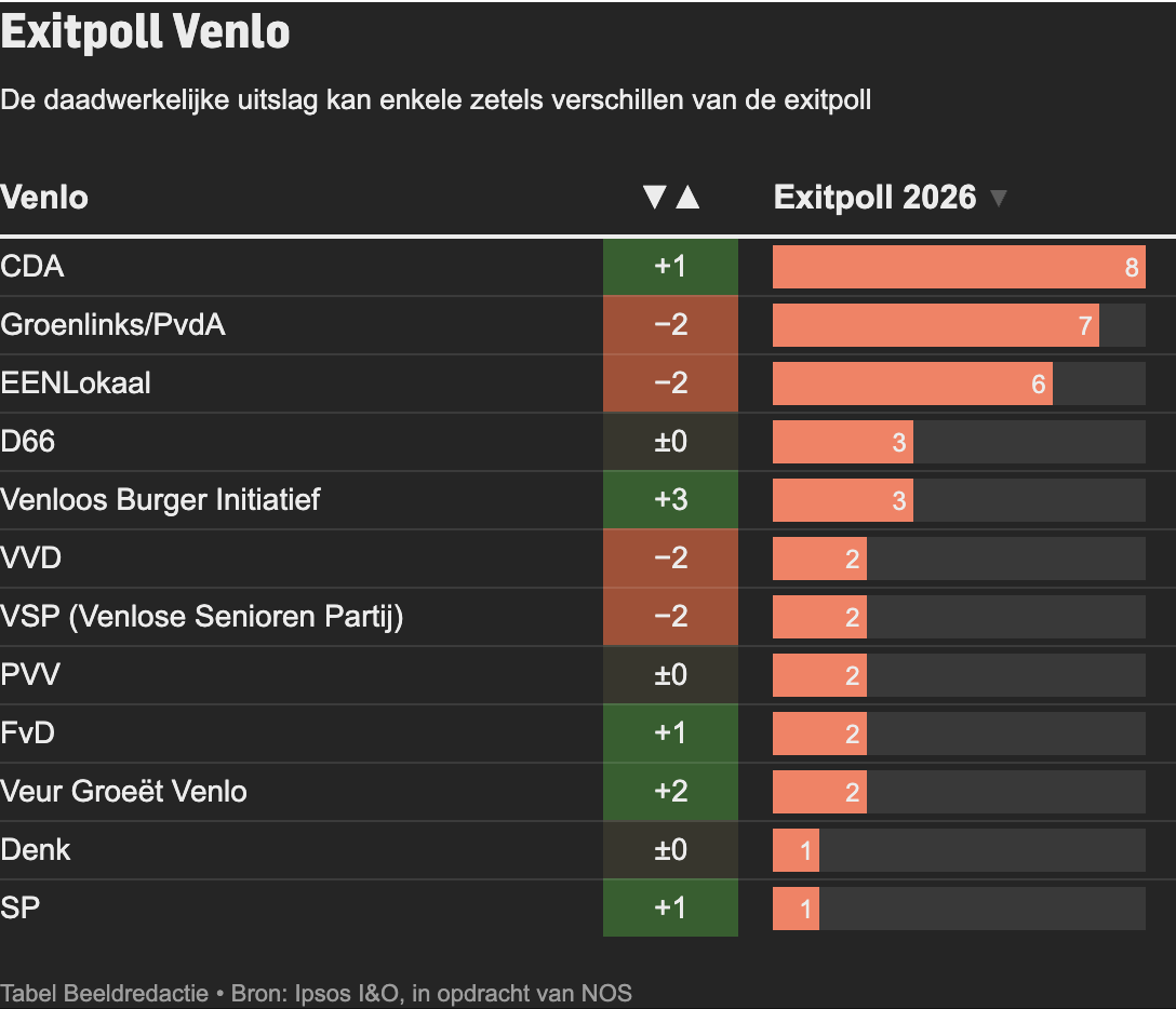 Het CDA is volgens de exitpoll van Ipsos I&O de grootste partij geworden in Venlo. De partij komt uit op 19,2 procent van de stemmen en 8 zetels. Dat is één zetel meer dan bij de gemeenteraadsverkiezingen van 2022. Daarmee lijkt het CDA in de Limburgse stad de duidelijke winnaar van de avond te worden. Nieuwkomer Venloos Burger Initiatief, opgericht vanwege onvrede over het azc-beleid, komt binnen in de raad met drie zetels. FVD stijgt van 1 zetel naar 2 zetels.