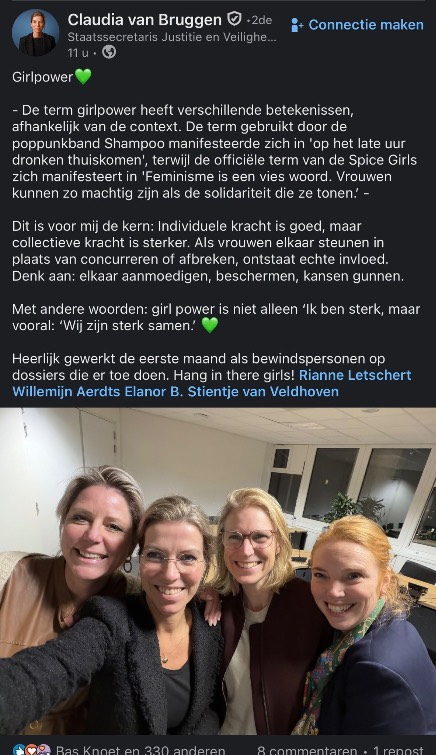 Een LinkedIn-bericht van D66-staatssecretaris Claudia van Bruggen (Justitie en Veiligheid) leidt tot stevige reacties. In de post staat het begrip ‘girlpower’ centraal. De bewindspersoon koppelt het thema aan haar werk in het kabinet en deelt een selfie met andere vrouwelijke D66-ministers. De toon van het bericht roept bij critici vragen op over professionaliteit en inhoud. Voormalig BBB-Kamerlid Claudia van Zanten noemt de tekst 'vrij infantiel'.