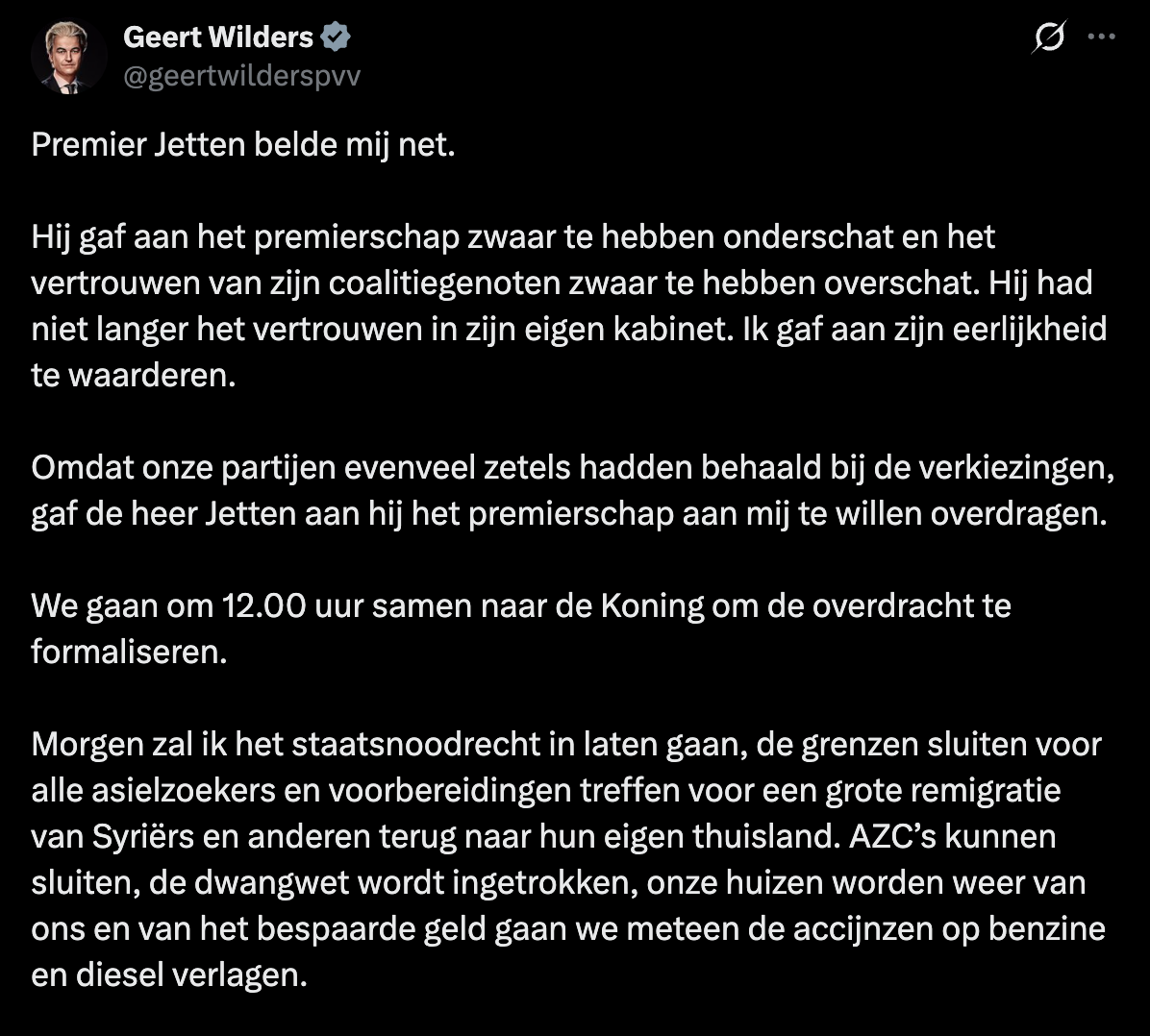 PVV-voorman Geert Wilders werd op woensdagochtend gebeld door niemand minder dan premier Rob Jetten. Jetten wilde namelijk zijn hart luchten bij Wilders. Het premierschap valt de D66'er zwaar en dus vroeg hij aan Wilders of hij zijn rol wil overnemen. Uiteraard ging Wilders in op het verzoek en daarnaast is het 1 april en kon Wilders niet laten om een grap te delen met zijn achterban.