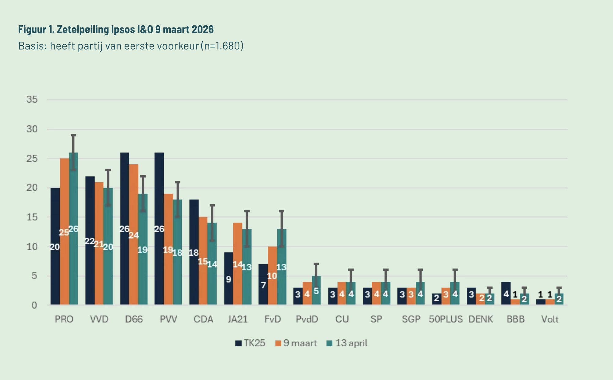 In een nieuwe zetelpeiling van Ipsos I&O staat Progressief Nederland (PRO) bovenaan met 26 zetels. Toch laat dezelfde peiling een opvallende ontwikkeling zien: steeds meer Nederlanders beschouwen zichzelf als rechts. Daarmee ontstaat een paradoxaal beeld van het politieke landschap. De peiling is uitgevoerd van 11 tot en met 13 april 2026 en is de eerste meting sinds de aankondiging van de nieuwe partijnaam PRO, de fusie van GroenLinks en PvdA. Ondanks de koppositie is er geen duidelijke groei zichtbaar. De partij wint slechts één zetel ten opzichte van maart.