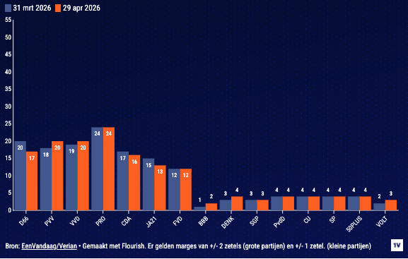 Andere coalitiepartijen blijven relatief stabiel. De VVD staat op 20 zetels en het CDA op 16. Aan de linkerkant groeit Progressief Nederland, dat op 24 zetels staat. De PVV schommelt en komt uit op 20 zetels. Volgens het onderzoek stappen linkse kiezers over naar Progressief Nederland, omdat D66 volgens hen te veel lijkt op de VVD of zich onvoldoende afzet tegen die partij.