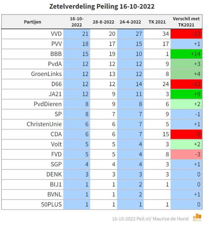 Als er nu verkiezingen plaats zouden vinden, zou VVD opnieuw de grootste partij van Nederland worden, maar wel met flink wat zetels minder. De partij van premier Mark Rutte verliest volgens de meest recente peiling dertien zetels en komt daarmee op 21 zetels uit PVV volgt met 18 zetels op de voet en BBB is met vijftien zetels de derde grootste partij. Ook andere rechtse partijen scoren goed. JA21 stijgt door en komt op een totaal van 12 zetels. FVD zou op dit moment 5 zetels halen en SGP 4. BVNL komt met twee zetels in de Tweede Kamer.